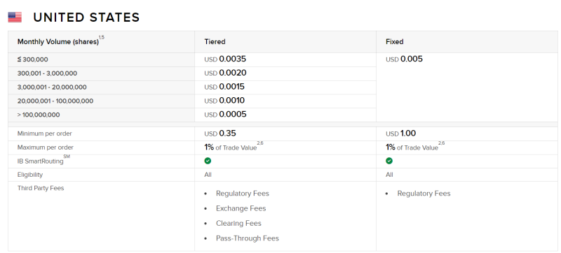 Na nově otevřeném účtu jsou komise nastaveny na „Fixed“. Tyto komise zahrnují všechny náklady, které s transakcí souvisí. Platí se zejména samotnému brokerovi, ale ke každému obchodu se vztahují také drobné poplatky pro burzu, regulatorní orgány, clearingové společnosti a podobně. U Fixed není potřeba se o strukturu poplatků starat, protože Interactive Brokers účtuje vždy jednotnou sazbu 0,005 USD/akcie s minimální částkou 1 USD.
