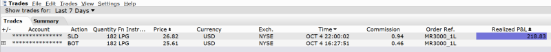 4.10.2023 jsem limitním příkazem nakoupil 182 akcií LPG. Mám nastaveno účtování komisí „Tiered“ a komise byla účtovaná 0,46 USD. Pokud bych měl „Fixed“, byla by komise 1 USD. Tedy komise je méně než poloviční! Pozici jsem ukončoval stejný den. Pro výstupy používám běžně market příkazy, které jsou dražší. A je také vidět, že komise mi byla účtovaná 0,94 USD. Je to stále méně, než „Fixed“ komise, která by byla 1 USD, ale rozdíl již není tak markantní.