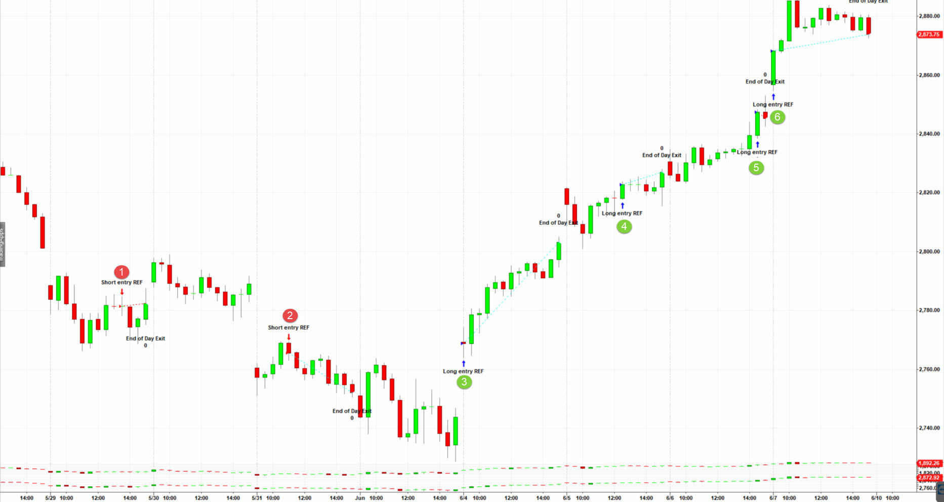 Systém nyní ve zvýšené volatilitě obchodoval aktivněji. Za posledních devět obchodních dnů vidíme šest vstupů. Dva short a čtyři long. Většinou jde o menší zisky/ztráty. Ale obchod číslo 3 představuje přesně typ dne, na který systém čeká – e-mini ES trendovalo od otevření do close a systém realizoval zisk přes 1 700 USD/kontrakt. To už je slušné.