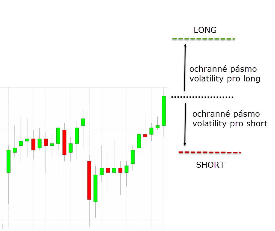 Nákres je ilustrační, ale dobře vystihuje podstatu obchodu. Běžnou volatilitu pohybu můžeme například počítat pomocí ATR a hodnotu přičítat/odečítat od close předešlého dne. Dostaneme úrovně, po jejichž překonání vstoupíme do dlouhé nebo krátké pozice.