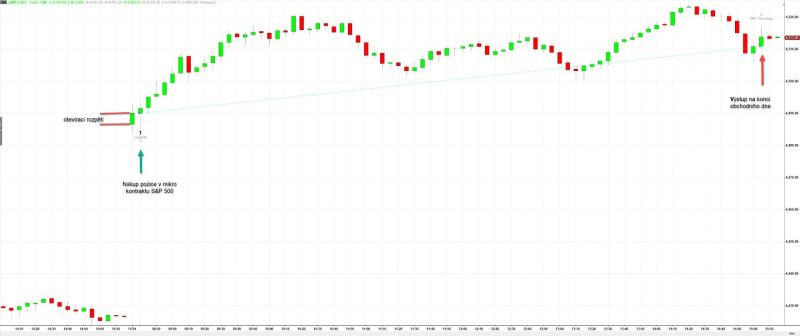 Ukázka vstupu do dlouhého breakout obchodu v akciovém indexu S&P prostřednictvím mikro kontraktu MES tak, jak je to popisováno v pravidlech obchodního plánu intradenního breakoutu. Profitabilní výstup by v tomto případě byl na konci obchodní seance.