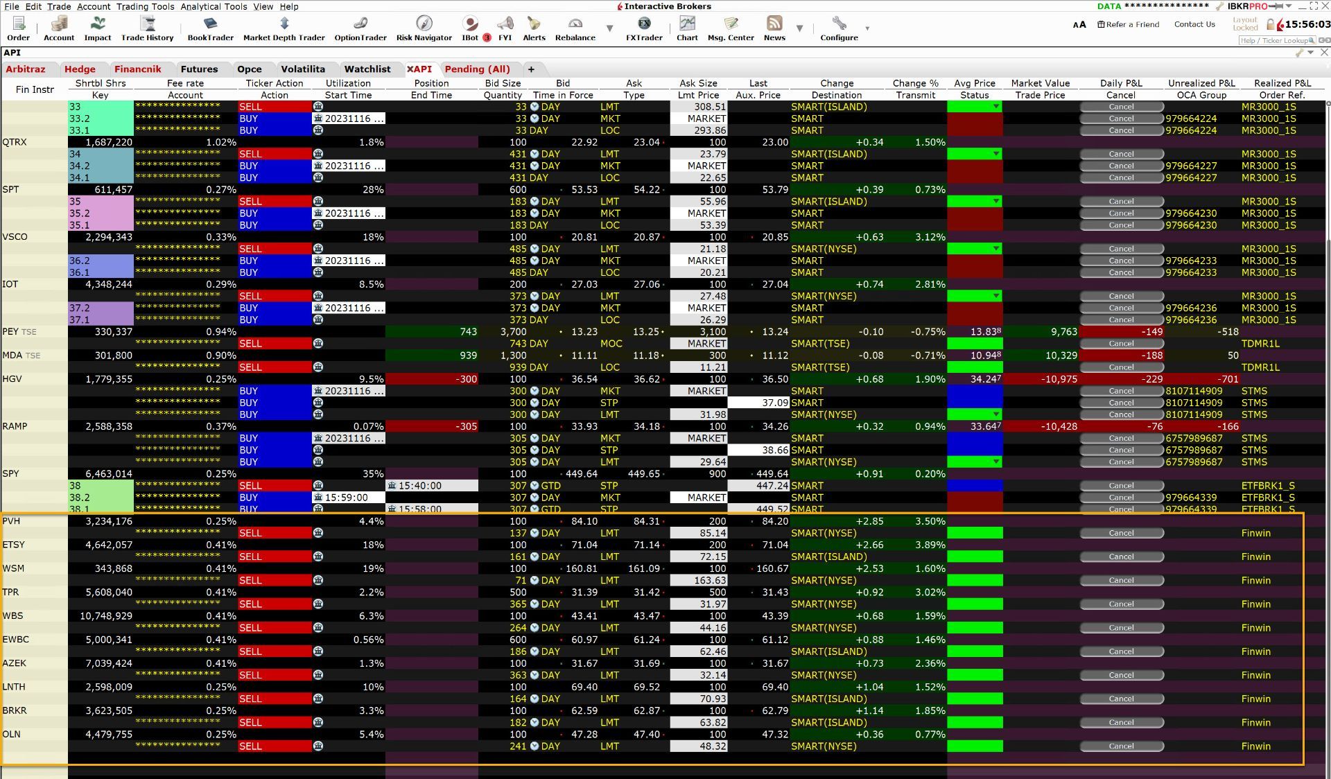 V praxi obchoduji tak, že si na základě pravidel diskutovaných ve videu připravím několik desítek akcií, které mohu daný den obchodovat. Následně mi můj trading skript, který jsem si vytvořil v Pythonu, zadává limitní příkazy do trhu na předpřipravené úrovni s cílem vstoupit do maximálně 10 pozic. Takto vypadaly například pozice zadávané do obchodní platformy na začátku obchodní seance 15.11.2023: