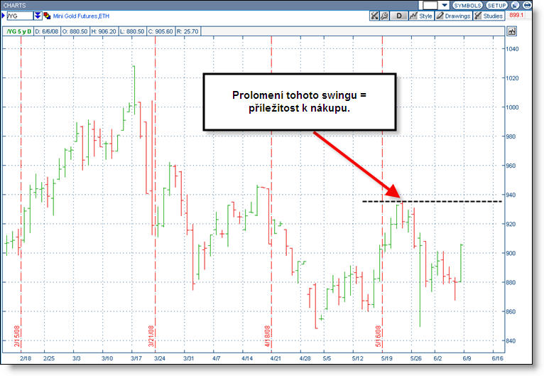 Nejprve graf se zlatem (YG). Jelikož ropa právě udělala svá nová maxima a akciové indexy se znovu začaly propadat, poměně silně věřím v další růst ceny zlata. Jako ideální příležitost ke vstupu vidím překonání posledního upswingu (obchodování na základě swingů je jednou z mých nejoblíbenějších technik a naučil jsem se jí z knihy Larryho Williamse Dlouhodobá tajemství krátkodobých obchodů).