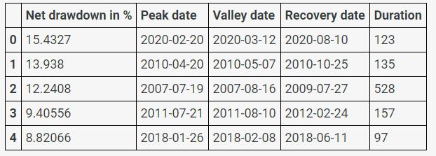 Backtest má krásně rostoucí křivku. Výkonnost překonává benchmark (index S&P 500) a má výrazně nižší volatilitu (což je to, co by nás mělo zajímat). Historické sharpe ratio po odečtení komisí je na úrovni 1,67. Z mého pohledu jednoznačně solidní cesta, jak se do obchodování pustit a těžko hledat výrazně lepší. Přesto, když se podíváme na tabulku pěti hlavních drawdownů, tak vidíme, že trvaly několik měsíců a 12% drawdown v roce 2007 byl dokonce skoro dva roky: