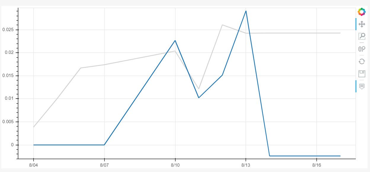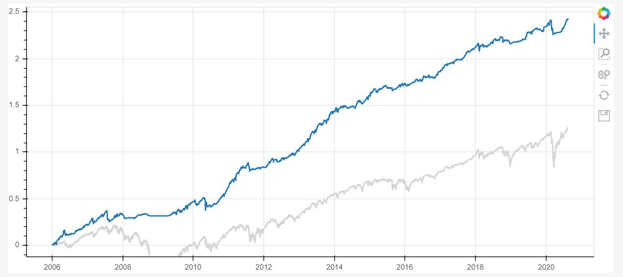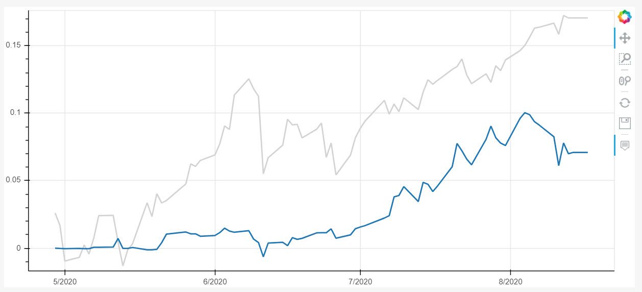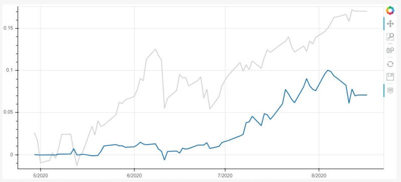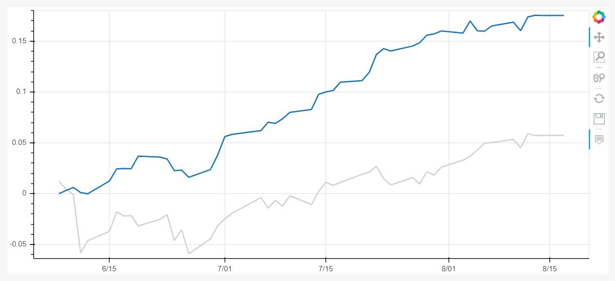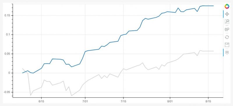 Například nyní asistuji jednomu z traderů se startem do živého obchodování. Obchodník začal s nepatrně upravenou strategií Monday Buyer po absolvování posledního swingového workshopu pořádaného letos na jaře. Té se od spuštění vede krásně. Modrá křivka je výkonnost strategie, šedá benchmark v podobě S&P 500: