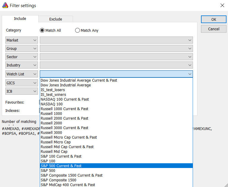 Pokud tak potřebuji otestovat systém na akciích obsažených v indexu S&P 500 a chci dostat realistické výsledky (tedy zohlednit i historické složení indexu a obchodovat i dnes delistované akcie), tak si nejprve v Amibrokeru vyberu předpřipravený „watchlist“ S&P 500 Current & Past automaticky připravený v rámci Norgate Data: