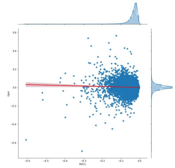Korelační graf zkoumající závislost mezi krátkodobou korekcí a budoucími výnosy. Podrobněji se tématu věnuji v tomto tutoriálu TechLabu.