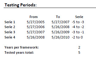 V prvé řadě jsem vytvořil ve svém testovacím Excelu speciální makro, které testuje ve 4 různých časových sériích, s posunem začátku po 1 roku a délkou trvání testované série 2 roky. Jinými slovy, rozdělil jsem oněch 5 let vybraných pro backtest na 4 stejně dlouhé dílky, s tím, že každý začíná a končí v jiný okamžik. Tím mohu nahlédnout na chování systémů v různých rozdílných úsecích dané periody. Názorně testování 4 sérii vypadá takto: