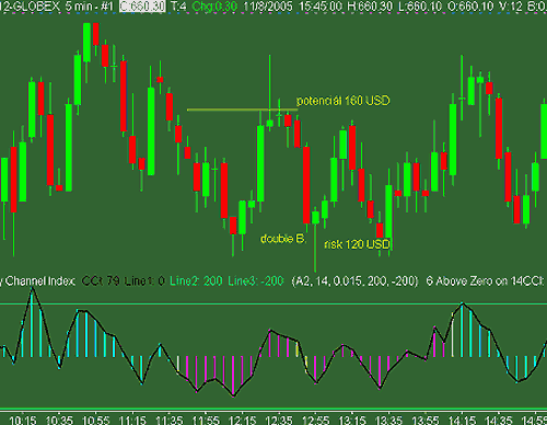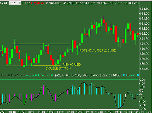 Na posledním obrázku je pak případ, kdy formace double bottom nabízí potenciál 160 USD při risku cca 120 USD. Takové RRR je už pro mě velmi, velmi nepříznivé a o podobném obchodě už vůbec neuvažuji. Ve svém pravidlu RRR jsem totiž velmi zásadový a snažím se toto pravidlo neporušit v žádné situaci.