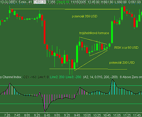 Na obrázku 2 můžeme vidět další příklad. Tentokrát se jedná o trojúhelníkovou formaci, u které můžeme vzít v úvahu jako potenciál například high a low aktuálního dne (jeden z mých skutečně velmi osvědčených indikátorů potenciálu). Vidíme, že cesta vzhůru čítá nějakých 350 USD, cesta dolů pak cca 200 USD. Risk v takovém obchodě by byl 80-90 USD, což tedy znamená, že při potenciální spekulaci směrem dolů by bylo mé RRR již nepříznivé a tak bych spekulovat u proražení trojúhelníku pouze a jen na proražení směrem vzhůru.