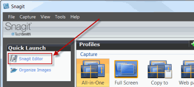 Popisování screenshotů v programu Snagit probíhá v Snagit Editoru. Ten se vám buď automaticky otevře po sejmutí obrazovky, nebo si jej kdykoliv můžete otevřít kliknutím například na link v levém menu programu: