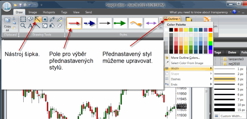 V Snagit se nástroje pro kreslení nalézají v menu Draw a piktogramy jsou myslím dostatečně jasné sami o sobě. Trochu specifický je způsob, jak se nastavují parametry nástroje. Chcete-li například nakreslit šipku, zvolte nejprve nástroj šipka a následně si můžete v menu vybrat některý z přednastavených stylů šipky. Pokud si vyberete některý z předdefinovaných stylu, můžete kliknout na menu Outline a dodatečně specifikovat všechny parametry zvoleného nástroje: