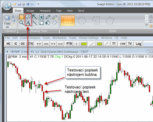 Jedním z hlavních důvodů, proč používám Snagit je velmi snadné komentování screenshotů s tím, že výsledek navíc vypadá dostatečně na úrovni. Zde malá poznámka – pokud sdílíte grafy s ostatními tradery je vždy dobré dělat popisky svých obchodů a myšlenek co nejsrozumitelněji. Bohužel občas má někdo tendenci mi posílat grafy, do kterých vytváří „popisky“ tahy myši v programu malování ve Windows (tj. ve stylu psaného písma) a takové obrázky jsou pro mě většinou naprosto nečitelné.