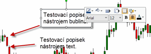 Textové poznámky lze do grafů vkládat principiálně dvěma nástroji – buď Text nebo „Bublina“. Rozdíl je ten že při nástroji „Blublina“ se vytvoří automaticky i pozadí, které oddělí popisek od screenshotu:
