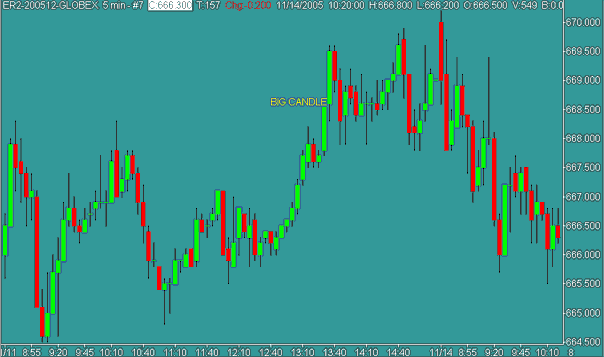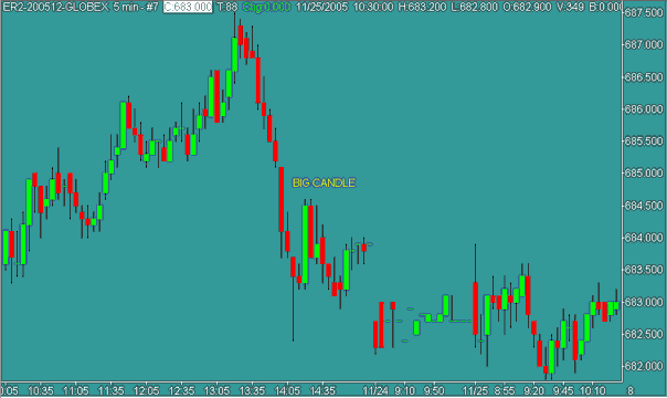 Během let jsem vypozoroval, že pokud se utvoří v právě rostoucím nebo klesajícím trendu extrémně dlouhá svíčka, většinou zhruba dvojnásobně a více delší než průměrná velikost předešlých svíček, pak toto znamená, že do rostoucího nebo klesajícího trendu právě „naskočili“ zcela poslední obchodníci ochotní nakupovat nebo prodávat. Tací až doposud váhali a čekali na skutečné potvrzení toho, že trend již skutečně započal. Samozřejmě se jedná o amatérské obchodníky, kteří většinou v trzích jen ztrácejí – právě proto, že do trhu naskakují téměř vždy až zcela na poslední chvíli a nikdy tak nedokáží získat z trendu pohyb dostatečně veliký k tomu, aby mohli stabilně profitovat. Nicméně tato emocionální reakce „amatérů“ je definována právě big candle – v případě rostoucích trhů zelenou big candle, v případě klesajících trhů červenou big candle.