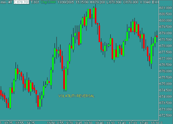 Poslední ze způsobů využití svíčkových grafů je způsob, který jsem nazval volatility reversal. Jedná se o poměrně spolehlivý způsob rozpoznání otočení aktuálního trendu, který dobře funguje v rámci daytradingu, převážně během prvních dvou obchodních hodin.