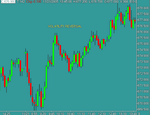 Již jsme si řekli, že v případě big candle dochází k prudké, impulsivní reakci davu „amatérů“, kteří v rozjetém trendu začnou hromadně nakupovat nebo prodávat doslova „na poslední chvíli“. Z takovéhoto big candle pak často vzniká ještě opačná reakce: stejné množství amatérů zjistí, že se „opět nechali nachytat“, a tak jak ještě před malou chvilku hromadně nakupovali, začnou již za moment uzavírat své pozice, a tudíž hromadně prodávat. Takový moment pak často prudce otočí trh – proto také název volatility reversal. Takovýto prudký, impulsivní obrat má pak většinou podobu dvou svíček zhruba stejné velikosti, přičemž v případě rostoucího trendu je jedna svíčka zelená a hned následující červená (indikace změny trendu z long na short) a v případě klesajícího trendu naopak jedna svíčka červená a hned následná svíčka, zhruba stejné velikosti, barvy zelené (indikace změny trendu ze short na long).