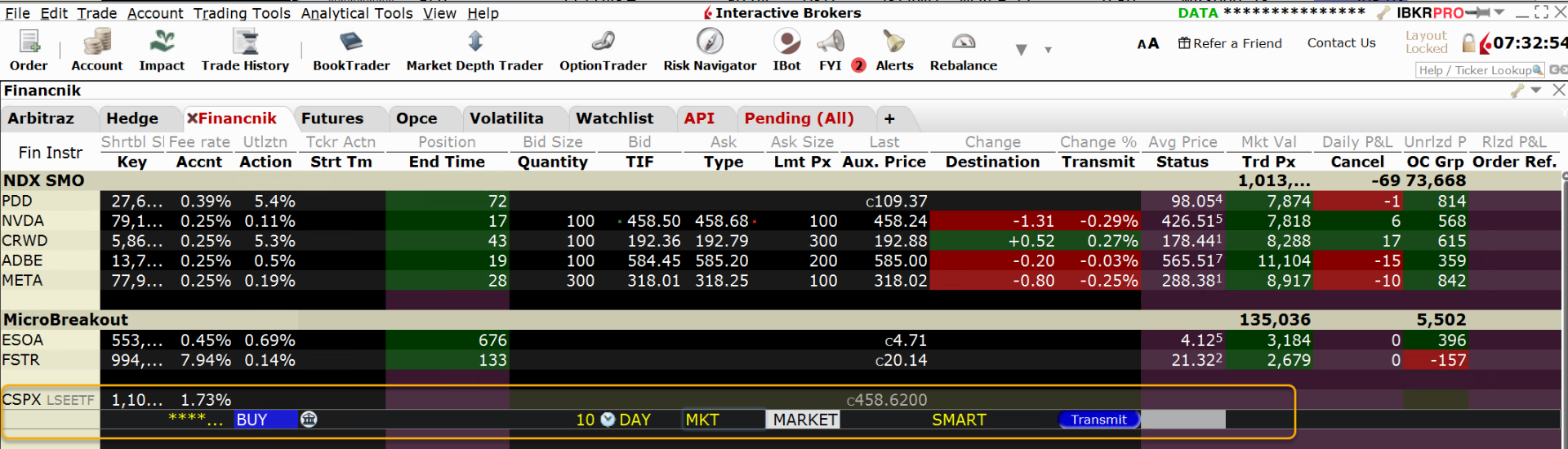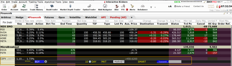 V platformě je vidět, že mám různé akcie nakoupené (např. NVDA, ADBE, META atd.). To jsou pozice, které držím právě v rámci zmíněných systematických obchodních plánů. První blok, kde je vidět aktuálně otevřený profit 73 668 Kč (poslední sloupec) se vztahuje k rotační momentum strategii na Nasdaqu. Druhý, kde je vidět aktuální otevřený profit 5 502 Kč, se vztahuje k breakout strategii MicroBreakout. Tyto a další obchodní plány na Finančníkovi sdílím, včetně průběžného komentáře a náhledů do mé brokerské platformy, v rámci obchodní skupiny Trading Room, kde se můžete různé styly obchodování naučit a především je skládat do portfolií (což je celý smysl toho, proč na Finančníkovi systematické plány obchodujeme).