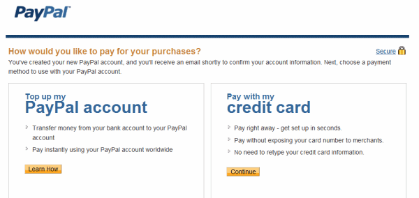 Nyní máte možnost si zvolit, zda-li chcete platit kreditní kartou (pay with my credit card), nebo si účet „předplatit“ převodem z účtu (top up my paypal account):
