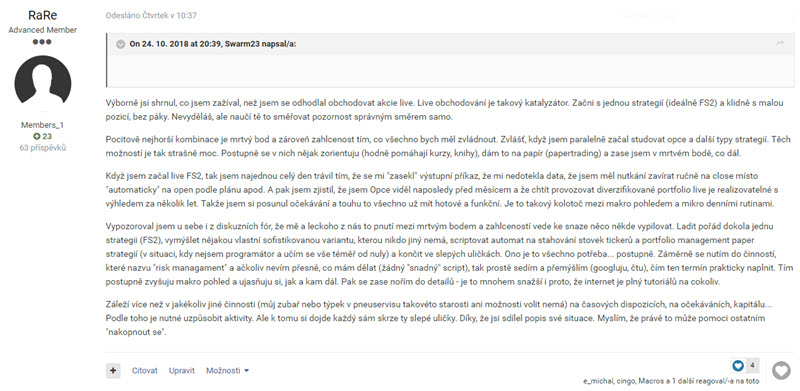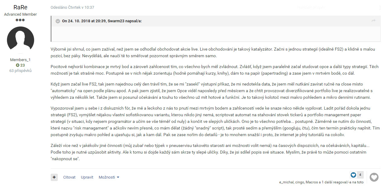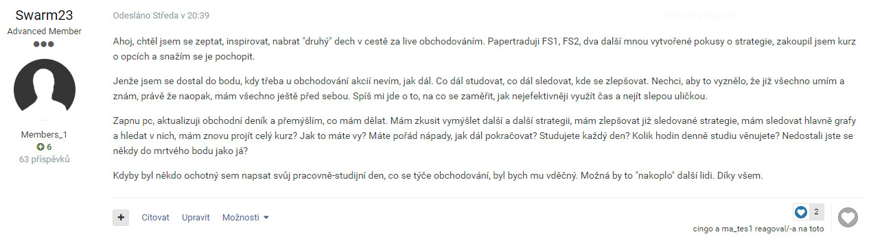 Ve středu publikoval trader Swarm23 v uzavřeném vláknu Blok 1: Trading jako business z mého pohledu velmi důležitý dotaz týkající se správného investování volného času po zvládnutí papertradingu první strategie: