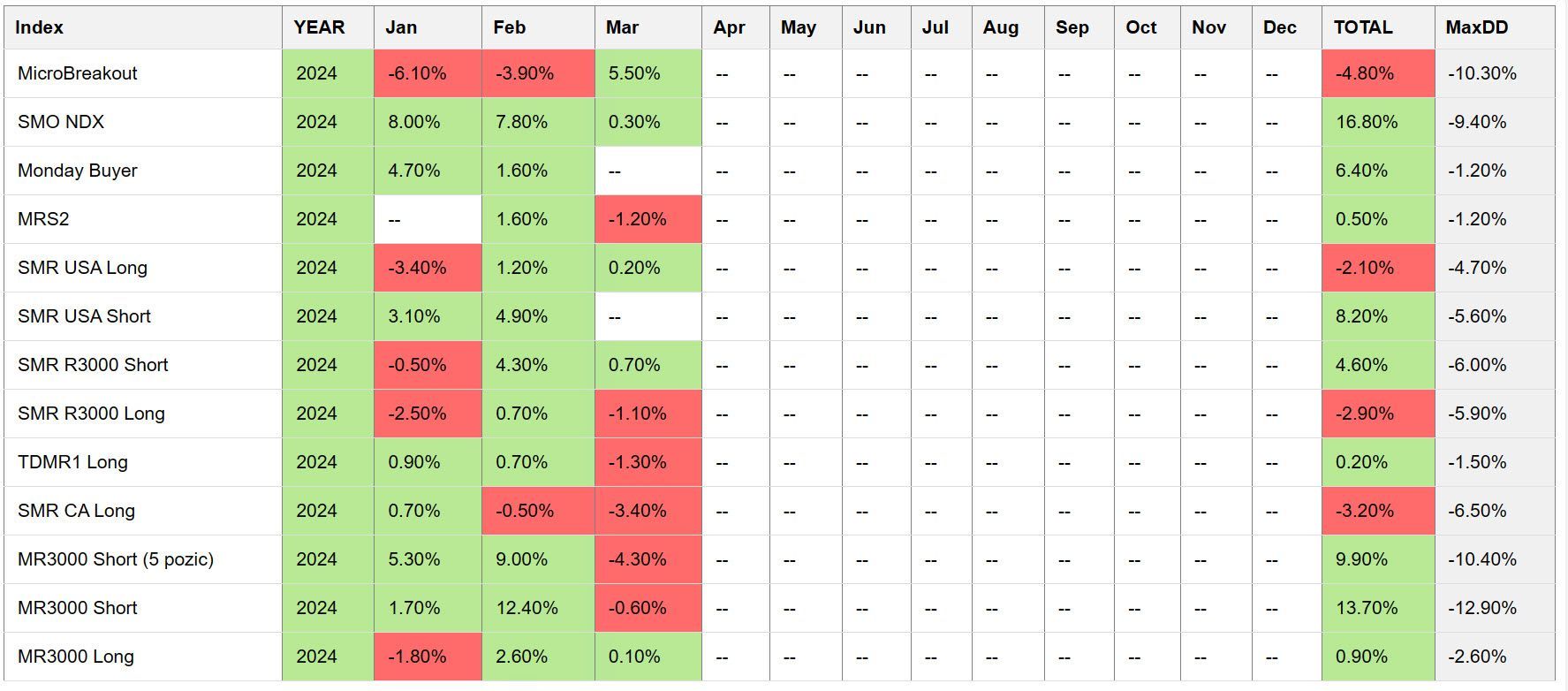 Jde o swingové strategie pracující s různými principy – trend following, breakout, mean reversion. Long a short. U všech strategií jsou dopředu k dispozici signály vstupů a výstupů. Pointou sdílených strategií je mít v trzích něco, s čím můžete začít pracovat na tom, co je podstatné – systematičnost a diverzifikace. Na screenshotu vidíte hypotetickou letošní výkonnost strategií. Hypotetickou proto, že ne vše obchoduji živě a ne vše obchoduji podle těch nejjednodušších pravidel - což je mimochodem i předmětem Trading Roomu. Ukazovat, jak funguje reálná praxe tradingu a jak můžeme k mechanickému obchodování přistupovat.