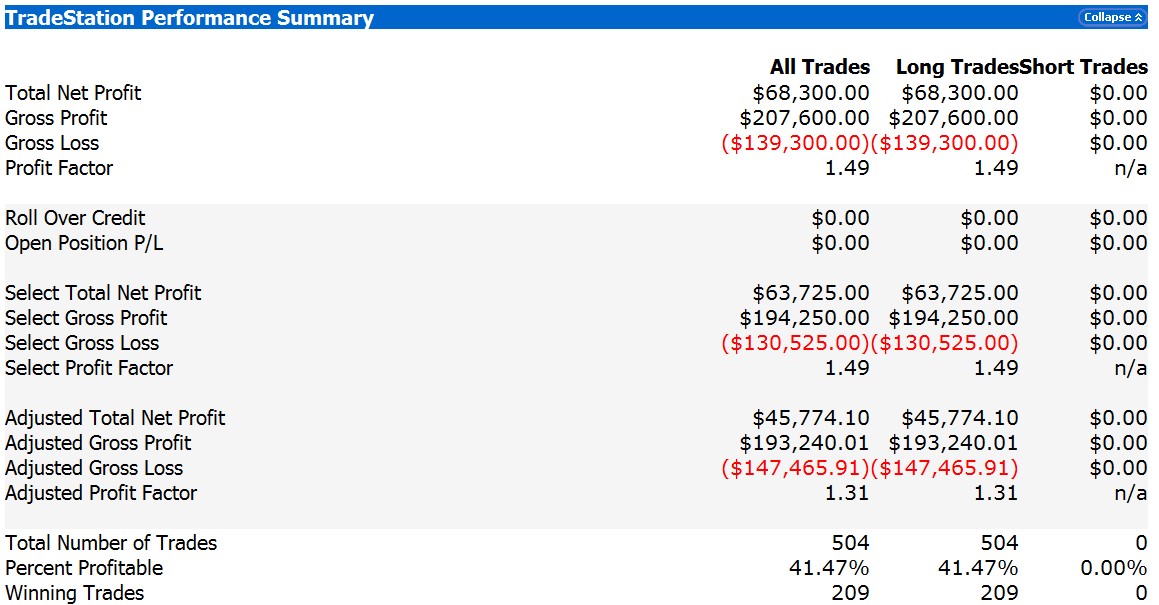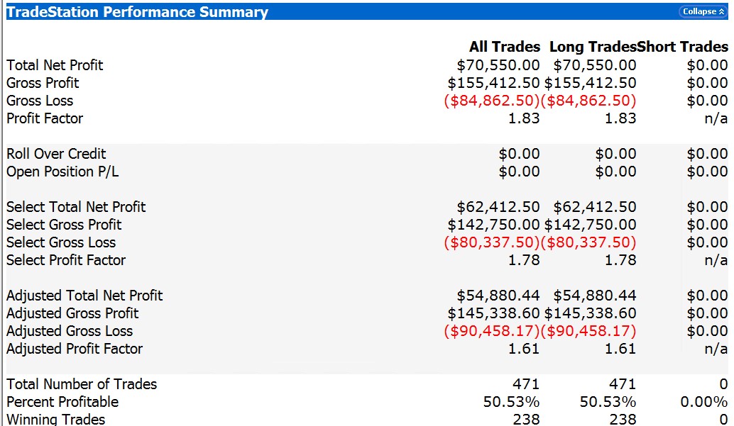 Opět vcelku uspokojivé parametry, které by teoreticky nebylo ani třeba vylepšovat – obzvláště pak v kontextu mého celkového portfolia. Na druhou stranu díky síle Market Internals by bylo škoda to alespoň nezkusit. Takže, po pár testech s mými MI chytrými kódy jsem vybral jednu z variant, která vypadá uspokojivě jak na IS optimalizaci, tak na OOS ověření, a která přinesla řadu zlepšení.