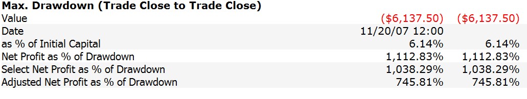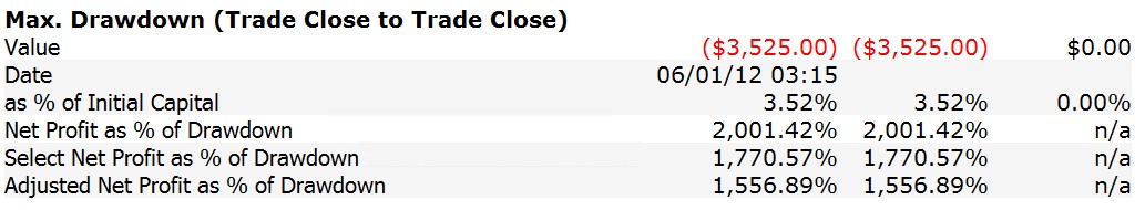 Vcelku zásadní zlepšení přichází u drawdownu, který se zlepšil z 6 137 USD na 3 525 USD, tj. podařilo se nám DD snížit téměř o polovinu (konkrétně o +42,6 %)! Zkuste si schválně vzpomenout, kolik práce jste v minulosti museli věnovat svému systému, abyste dosáhli alespoň 20procentní zlepšení drawdownu. Zde jediným nástrojem snižujeme drawdown téměř o polovinu – bez nutnosti zasahovat přímo do samotného systému!
