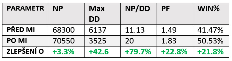 Začněme celkovým profitem (NP), který se po aplikaci MI ne vždy zlepší (většinou totiž dochází ke zlepšení drawdownu, a tudíž poměru mezi NP a DD). V tomto případě došlo ke zvýšení NP z 68 300 USD na 70 550 USD, tj. zlepšení o +3,3 %. Zatím nic až tak působivého, ale nebojte, bude to mnohem lepší!