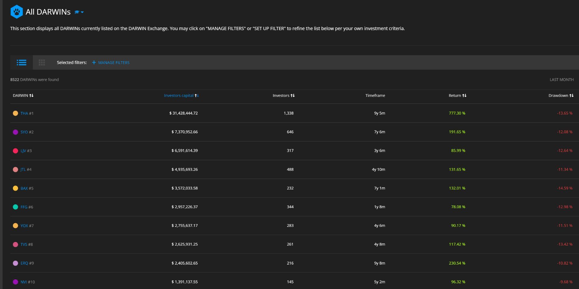 S další historií obchodování lze pak na výkonnost získávat i skutečný externí kapitál. V praxi to funguje tak, že Darwinex „zabalí“ výkonnost tradera do indexu, ve kterém je normalizován risk. Těmto indexům se na platformě říká DARWINY, a všechny tak obchodují s podobně vysokým riskem. Pokud se investoři rozhodnou alokovat kapitál do vašeho indexu, získáváte z alokací 15 % výkonnostní poplatek. Což už rozhodně mohou být zajímavé peníze. Obchodník s aktuálně nejvyšší alokací spravuje na Darwinexu přes 31 milionů dolarů. Sami si pak můžete spočítat, kolik jsou odměny (15 % ze zisku). Takto vypadá aktuálně přehled investorských alokací: