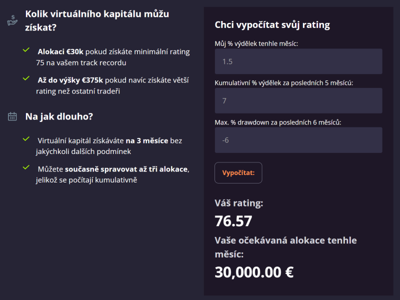 Pokud budete obchodovat například se zmíněnou výkonností 1,5 % a drawdownem max. 6 % za posledních 6 měsíců, pak splňujete minimální rating pro splnění alokace 30 000 euro: