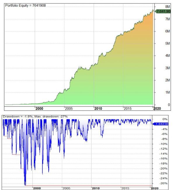 Pro inspiraci – takto vypadá equity křivka popisovaného přístupu aplikovaného na akcie, které mám v databázi (včetně delistovaných). Jde o více než 20 000 titulů, z nichž systém vybírá ty s nižší likviditou (ale stále obchodovatelné a s cenou nad 1 dolar). Systém drží max. 40 pozic současně a každé přiřazuje 5 % kapitálu. Od roku 1995 obsahuje test velmi slušných 10 564 obchodů: