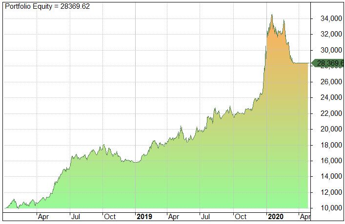 Zajímavější může být pohled na obchody od roku 2018, pokud bychom začali s kapitálem 10 000 dolarů a vstupovali/vystupovali na otevírací ceně další den po generovaném signálu (abychom si tak mohli připravit například limitní příkazy atd.). Při započítání komisí z Interactive Brokers bychom stále dosahovali ročního zhodnocení přes 50 % při poměrně nízkém drawdownu. V praxi toto zhodnocení bude snížené o různé skluzy v plnění, na které je třeba se při obchodování akcií s nižší likviditou připravit, nicméně stále je zde z mé zkušenosti dost prostoru pro profit.