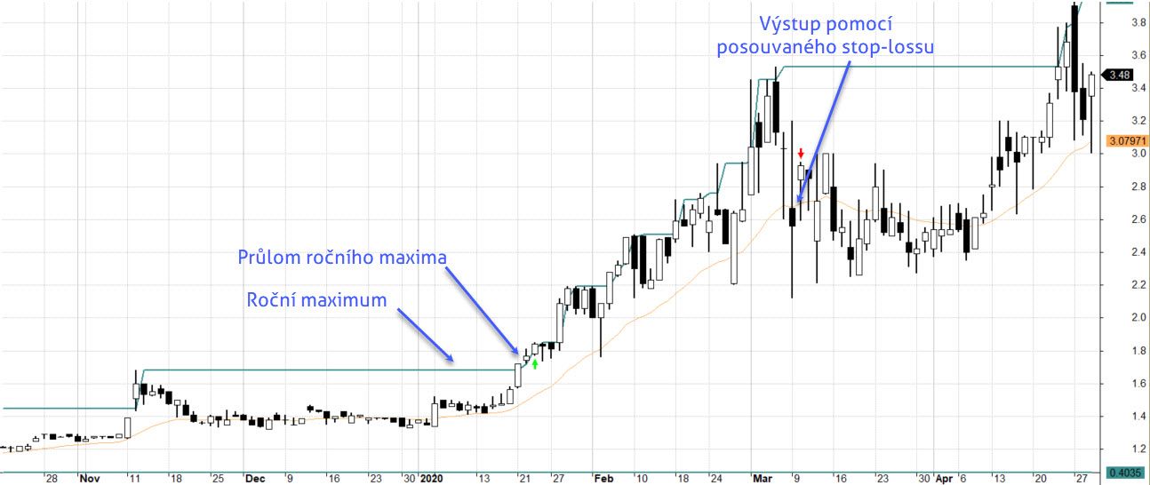 Swingové breakout strategie přitom nemusí být nijak komplikované. Konzervativně se stačí zaměřit na dlouhodobé cenové maximum (například poslední rok) a do pozice vstupovat v momentě překonání této hranice. Strategie pak pracuje se základním stop-lossem (ten je zasažen, pokud trh po průlomu nepokračuje) a posouvaným (trailing) stop-lossem, jehož cílem je z pohybu dostat co nejvíce. Obchod tak může vypadat například takto:
