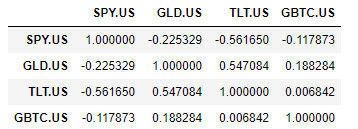 Portfolia mohou mít mnoho podob. Pro ilustraci si pojďme ukázat, jak vše vypadá na takovém velmi zjednodušeném příkladu, kdy budeme pracovat s americkými akciemi (SPY), dlouhodobými americkými dluhopisy (TLT) a zlatem (GLD).