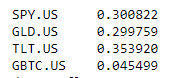 Na ukázkovém zjednodušeném portfoliu SPY, TLT a GLD by to znamenalo, že bych nyní například pracoval s následujícími váhami: