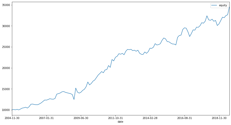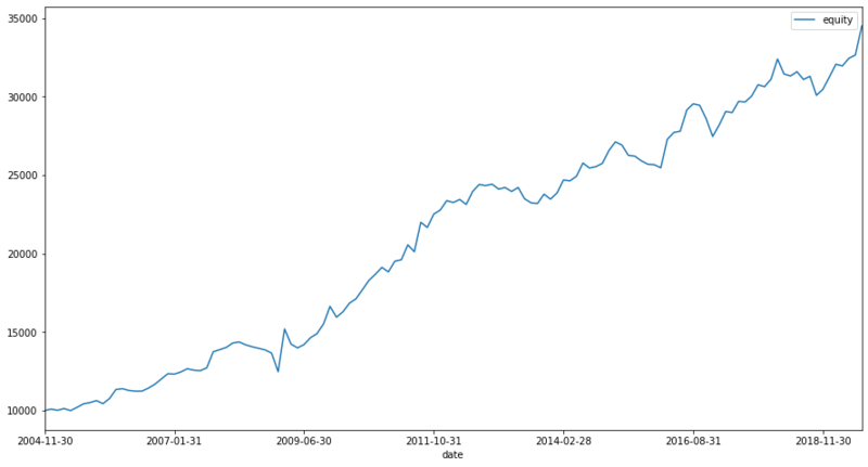 A takto pro ilustraci vypadá výsledek portfolia od konce roku 2004, kdy se jen každý měsíc mění počet shares v jednotlivých třech trzích na základě jejich historické volatility: