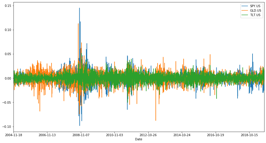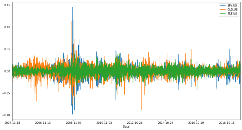 Jak jsou na tom SPY, TLT a GLD s volatilitou? Následující graf zobrazuje denní změnu cen v jednotlivých trzích: