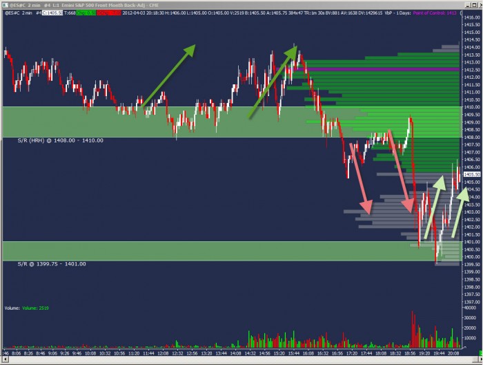 V rámci přípravy si dopředu představuji i základní „scénáře“ o tom, jakým směrem budu trh z daných oblastí obchodovat a kam by trh mohl směřovat. Jakmile je trh v dané oblasti, nemusím už příliš přemýšlet o tom, co dělat – už jen analyzuji risk/potenciál daného obchodu a čekám na vhodnou vstupní situaci. Tady je například graf odpoledního trhu ES ze dne 3.4.2012, kde zakreslené zelené S/R oblasti pocházejí z přípravy, kterou jsem zde publikoval předem, večer 2.4.2012: