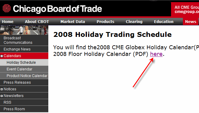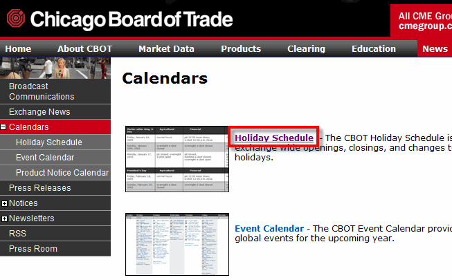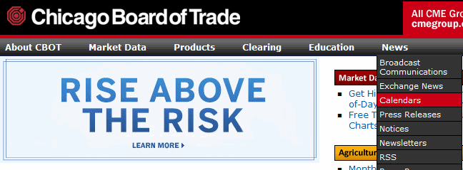 Dvě hlavní Chicagské burzy CME a CBOT se před časem spojily do jedné, takže je v zásadě jedno, přes jakou stránku se k informacím člověk dostane. Samozřejmě existují i přímé adresy, ale je dobré se naučit na stránkách burzy orientovat. Proto zde následuje postup, jak se ke kalendáři „doklikat“.