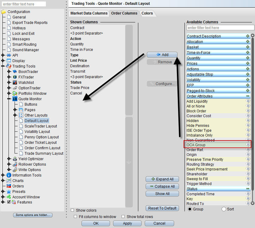V dashboardu TWS klikněte na ikonku „klíče“ (viz černá šipka s číslem „1“ na níže uvedeném screenshotu) a do layoutu si přidejte i sloupec s informací o OCA group. Naleznete jej v záložce Order Columns, skupina Order Attributes: