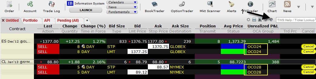 Taková situace může leckoho zaskočit a každý by minimálně měl vědět, jak jeho platforma a broker funguje. Pracujete-li s Interactive Brokers (který standardně drží OCO vazby na svých serverech) pak se můžete přesvědčit, zdali jsou vaše obchody zadávány včetně OCO vazem následovně: