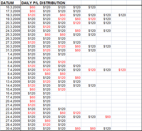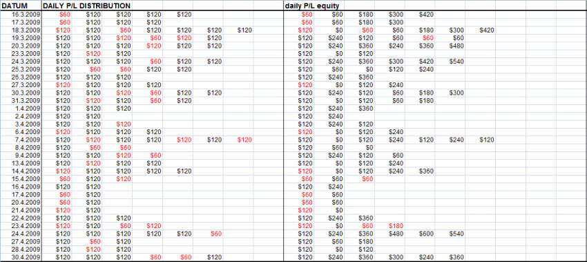 Samozřejmě, čím větší vzorek dat, tím delší stránka bude. Tento screenshot uvádím pouze jako příklad – vidíte, že každý řádek ukazuje nejprve datum daného dne a následně profity a ztráty přesně tak, jak šly za sebou pro každý jednotlivý obchodní den (černou barvou zisk, červenou ztráta). Vidíte tedy například, že systém na dané ukázce (jedná se pouze o jeden z mých aktuálně testovaných systémů, který je postavený na základu systému FinWin a využívá nižší timeframe s PT) měl dne 16.3. 2009 následující distribuci zisků a ztrát: nejprve ztráta -60 USD, následně 4 zisky po +120 USD.