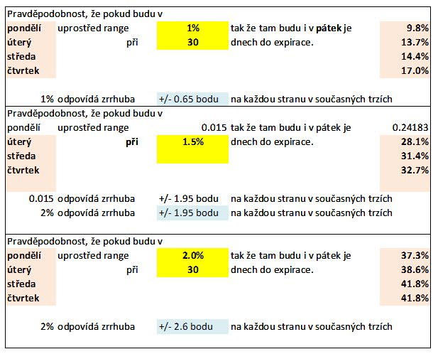Ve druhém testu (prostřední třetina) jsem pásmo rozšířil na 1.5%. Pravděpodobnosti sice lehce stouply, avšak stále jsou velmi nízké na to, abychom mohli doufat, že optimálně přívětivá situace na začátku expiračního týdne vydrží až do samotného expiračního pátku.