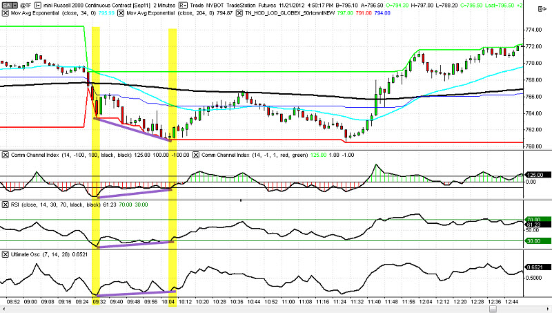 a) trh už udělal od svého otevření výraznější pohyb; například divergence v momentě, kdy trh e-mini Russell 2000 již urazil 1000 USD má rozhodně větší platnost jako varování před možným vyčerpáním trhu než divergence po pohybu 300 USD;