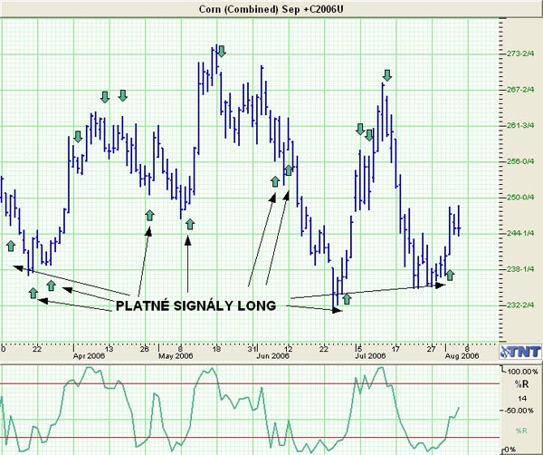 Ten nám dává poměrně jasný a konkrétní obrázek. Od počátku roku, zhruba od února, byl v trhu nastolen jasný a nepopiratelný uptrend. Naším cílem od začátku února tedy bylo vyhledávat na denních (daily) grafech vstupní úrovně s použitím Williams %R indikátorem pouze a jen na stranu long. Přepneme si tedy nyní graf z týdenního na denní a šipkami si označíme všechny regulerní vstupní signály do dlouhé pozice. Použijeme k tomu program Gecko Track´n´Trade, který nám šipky zakreslí automaticky – pouze s tím, že pro nás jsou platné pouze ty, které ukazují na stranu long, tudíž zespoda nahoru: