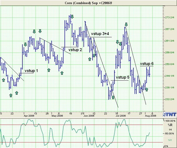 Velmi letmým odhadem se v trzích touto technikou nabízelo až 2800 USD na kontrakt. Zůstaňme však realisté. Není nikdy reálné vybrat profity až k vrcholu. Pokud bychom používal například metodu posouvaného stop-lossu - ať už pod každou novou úsečku nebo pod S/R úrovně, byl by úspěch získat alespoň polovinu – t.j. 1400 USD na kontrakt. Je to mnoho? Jak se to vezme. Už i s účtem 3000 USD můžete pohodlně obchodovat kukuřici se 2 kontrakty. To tedy znamená, že za poslední 4 měsíce bychom našich 3000 USD mohli „otočit“ do 3000 + 2x1400 = 5800 USD. Pokud dobře počítám, jedná se o zhodnocení téměř 100% za čtvrt roku a jeden měsíc. Znáte nějakou banku, která vám něco podobného nabídne?