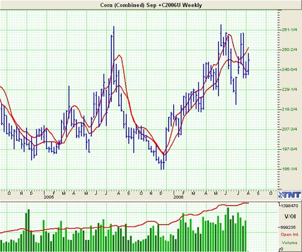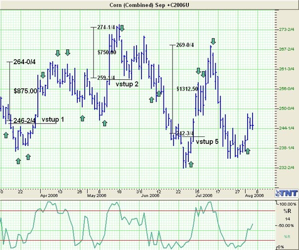 Jako ukázku použijeme trh kukuřice (Corn) a to z jednoduchého důvodu – mnoho nováčků právě s kukuřicí začíná obchodovat. Řekněme, že budeme obchodovat jednoduchou strategii s použitím Williams %R indikátoru, o kterém jsme již na finančníkovi psali. Využijeme jednoduchou, zcela základní techniku obchodování s tímto indikátorem: na týdenním grafu identifikujeme hlavní trend a na denním grafu pak budeme vyhledávat vstupy pouze a jen do směru trendu. Jako první tedy posoudíme obrázek týdenního grafu: