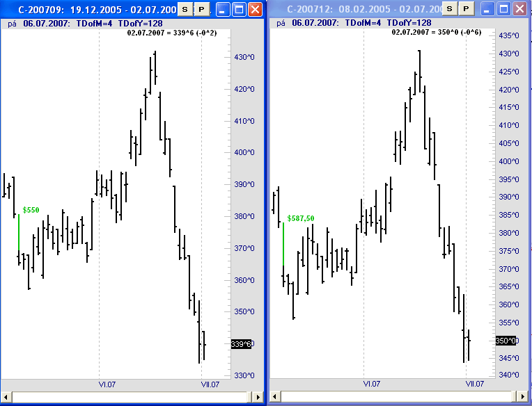 Grafy jednotlivých kontraktů jsou si velice podobné. Nalevo graf zářijové kukuřice, napravo graf kukuřice s termínem dodání prosinec 2007: