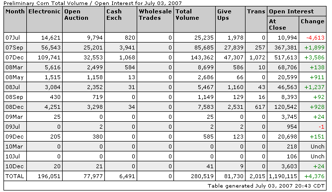 Ukázka cen kukuřice k datu 3. července 2007 - čím vzdálenější kontraktní měsíc, tím je cena komodity vyšší.
