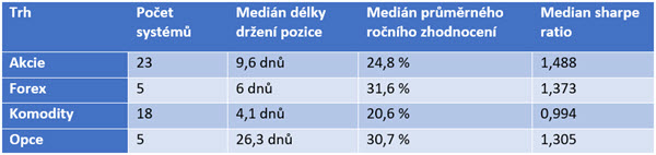 Ve sledovaném vzorku jsou obsaženy nejrůznější systémy – nejnižší průměrná doba držení je 0,1 dne (tedy intradenní obchodní systém), nejvyšší průměrná doba držení je 106,8 dne (již jednoznačně poziční obchodní systém).